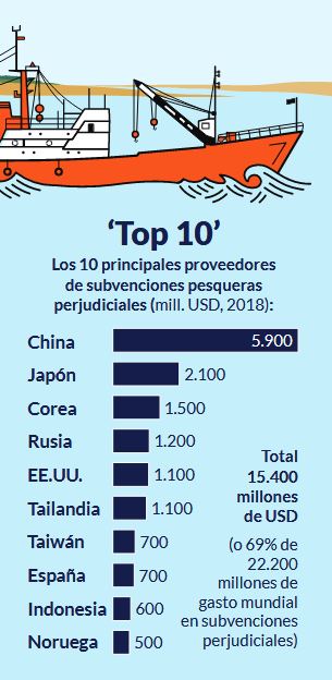 Juan Carlos Sueiro señala que los subsidios a la pesca industrial no afectan directamente a la pesca artesanal. Oceana, organización al que pertenece Sueiro, señala que los subsidios sí contribuyen a la “sobreexplotación de los recursos pesqueros, y que se estiman en unos 20 billones de dólares anuales; cifra equivalente al 25% del valor total de las capturas mundiales”. Sueiro, además, cuestionó que se le subsidie el combustible a la pesca industrial y no al pescador artesanal.